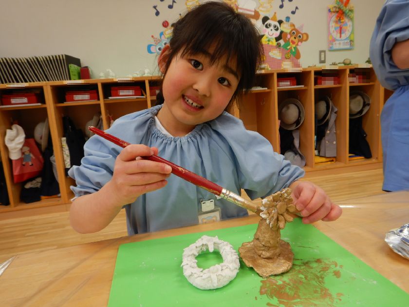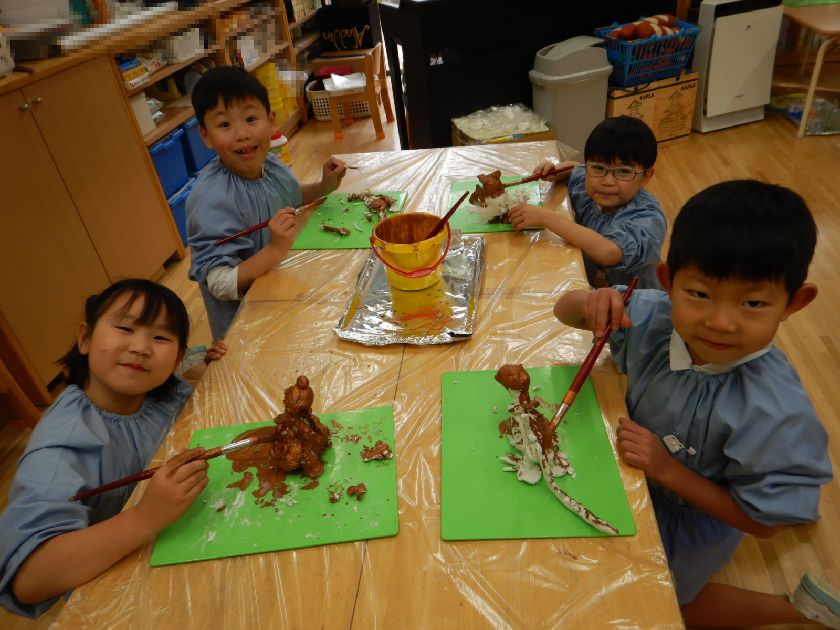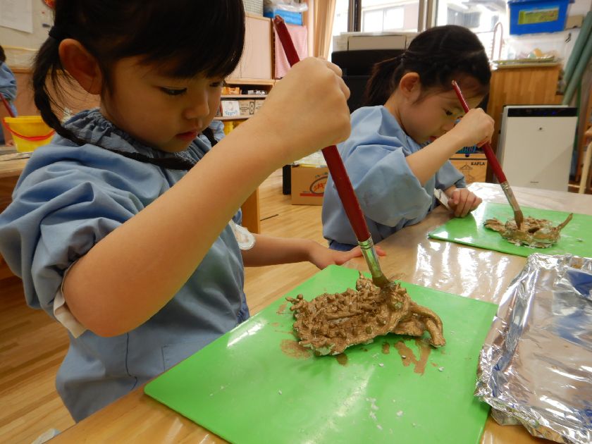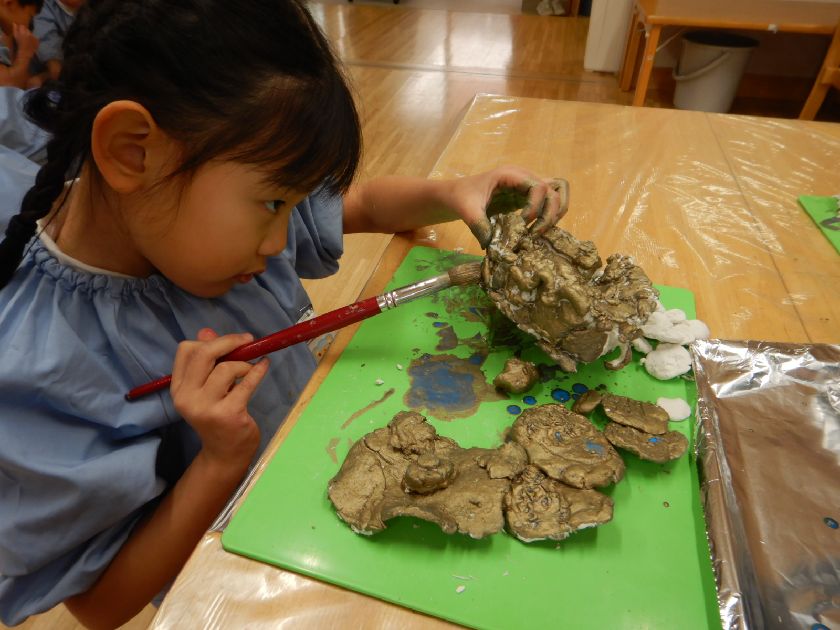 紙粘土で出来上がった作品にメタリックカラーを着色しました。テーマは魔法の洞窟の中で見つけた宝物☆なんだかそれらしい物に近づいてきましたよ。水彩絵の具とは違ったきらめきのある着色剤に目を輝かせながら作業に取り組んでくれました。筆を上手に動かして凹凸の部分も丁寧に塗り込みました。職人かのように真剣な眼差しで作業をしていたのが印象的でした。
