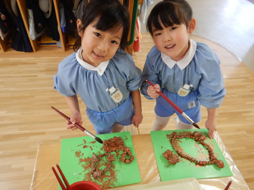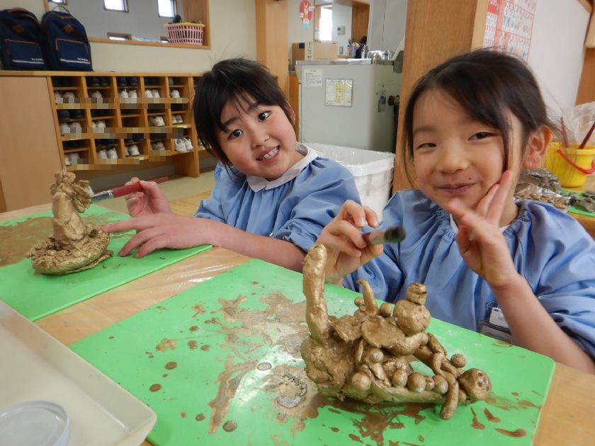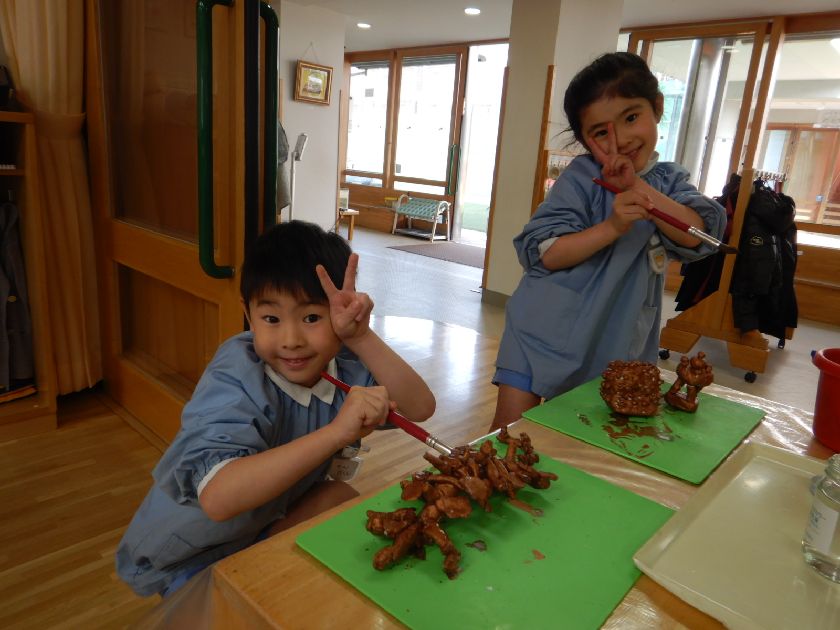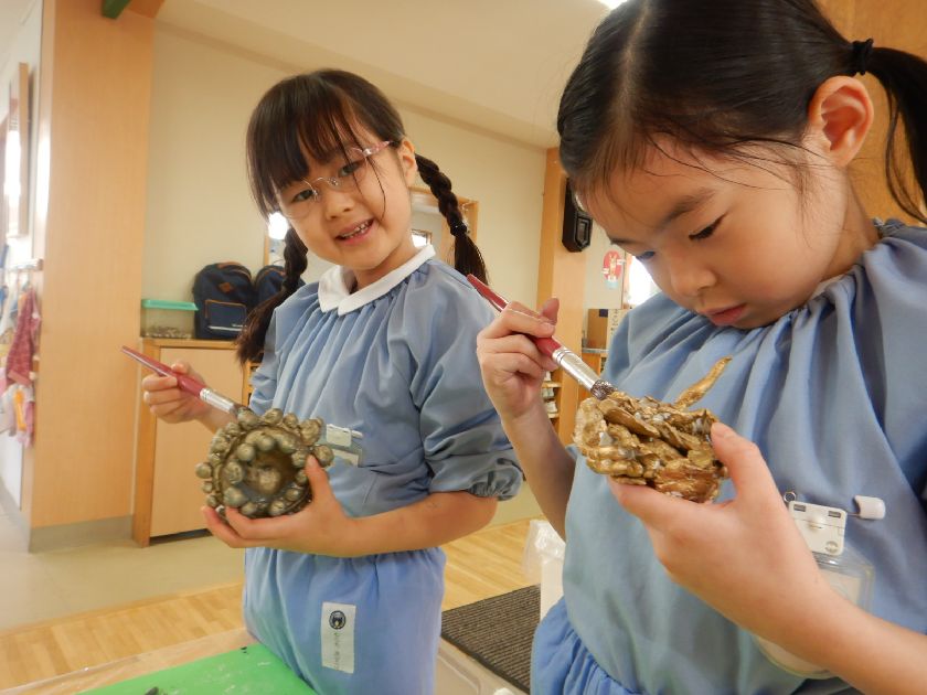 昨日の立体作品の続きです♪メタリックカラーに着色した部分に「さび」をつくりました。「さび」で魔法の洞窟から発掘された感じを表現です。さびを発生させたい部分を考えながら塗りましたよ。青さび発色液・黒さび発色液をメタリックカラーの上に塗ると空気中の酸素や水分と化学反応を起こし「さび」が発生するんです!!この不思議な化学反応を楽しみながら取り組みました。塗って数分で「かび」が発生していたのも面白かったですね♪
