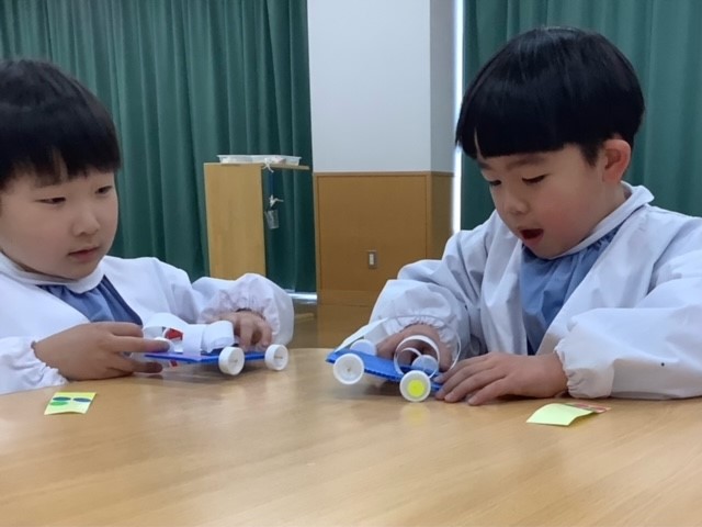 今回は「紙」をクルクル巻いて「紙ぜんまいばね」を作りました。この紙ぜんまいばねで車を動かすことができました!コツを覚えてみんな上手に走らせることができましたね!さすがでした!