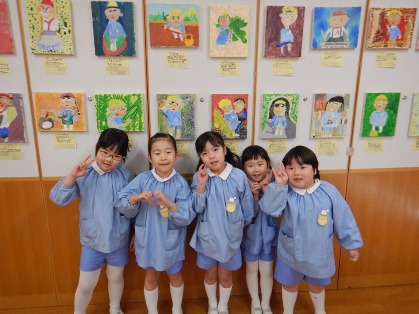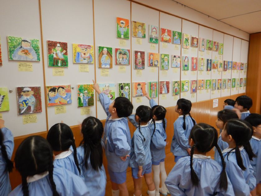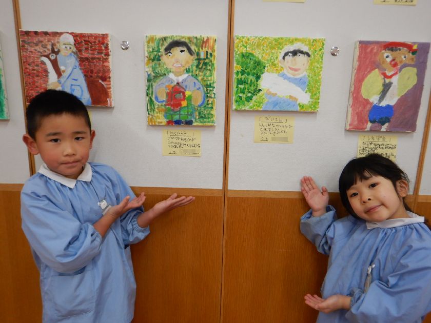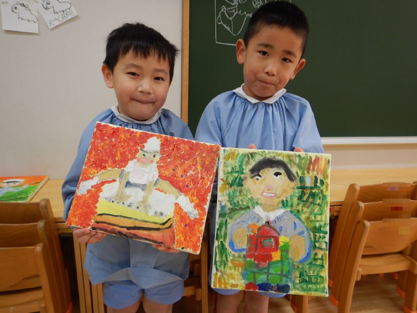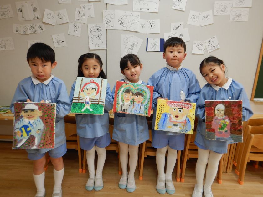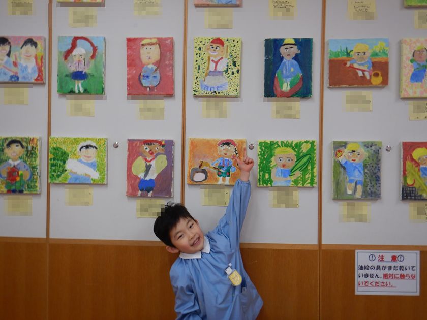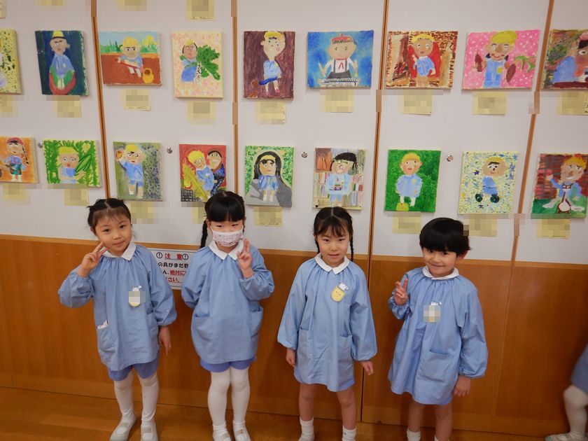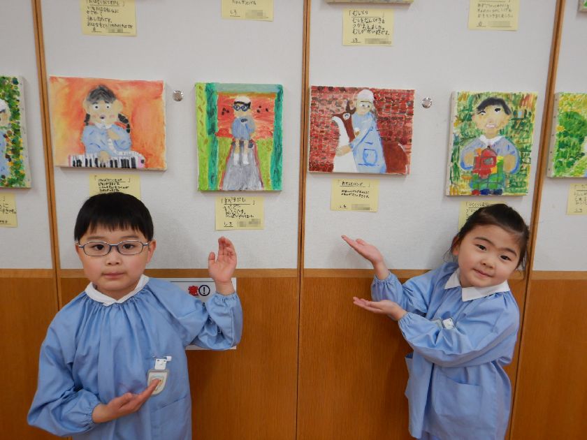2026.02.18 絵画☆油絵 年長組 年長児の力作 2学期後半から時間をかけて丁寧に取り組んだ「油絵」。完成した自分の油絵が展示されたことに喜びを感じ完成させた達成感に満ち溢れています。どれも素敵な作品で子どもの思いが込められています♪持ち帰った際には是非、細部までじっくりとご覧ください。