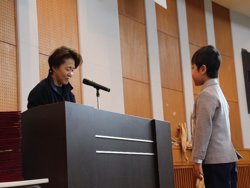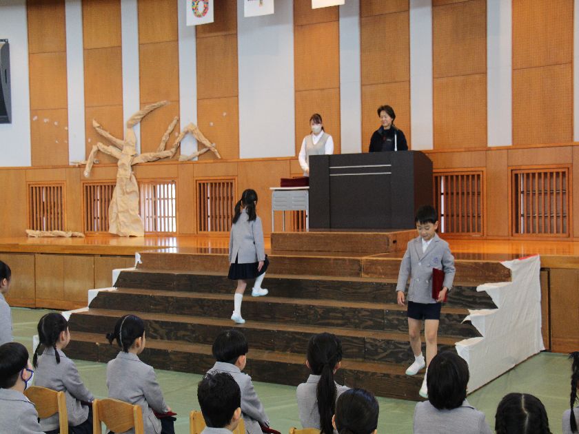 担任教諭から名前を呼ばれて大きな声で返事をし、大階段をあがる卒園児。