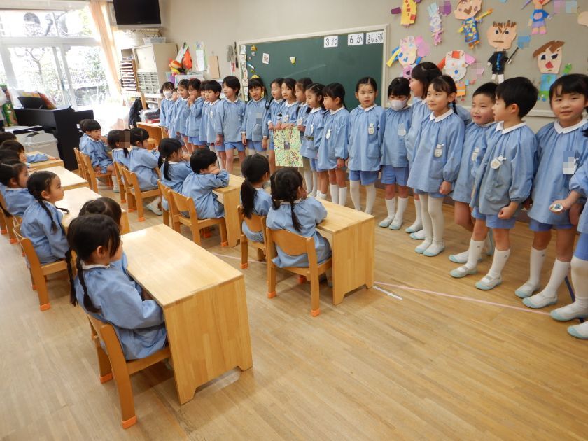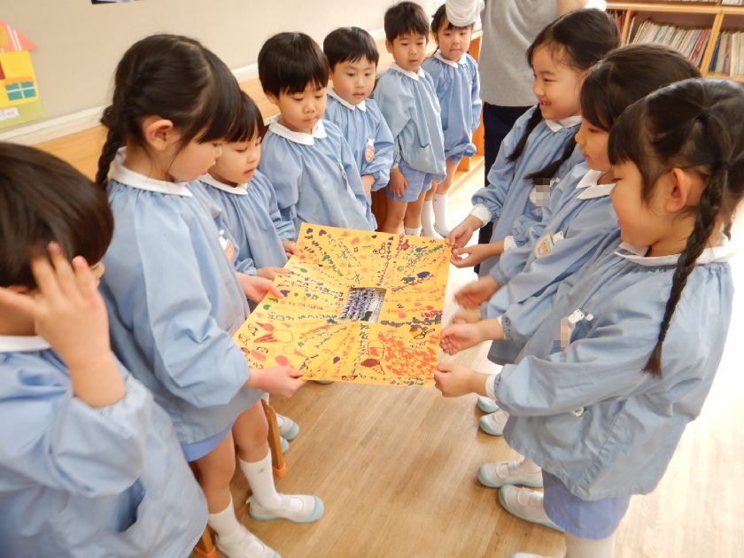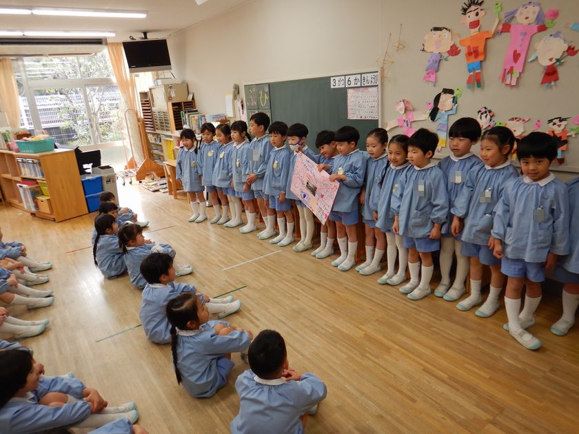 年少さんから可愛い壁面のプレゼント、年中さんからは素敵な大きな横断幕メッセージをプレゼントしていただき、今日はお礼に年長組からお手紙を各クラスに送らせていただきました♪本当の本当にお別れだね…。また会いにくるね。年長組・年中組でも頑張るよ!そんな言葉を交わしましたよ。お兄さんとお別れが寂しくて泣いてしまう年中児もいました。なんて微笑ましい光景でしょう。胸があつくなりましたよ。学年は違ってもそれだけ交流が深かったのでしょうね♪嬉しい出来事でした。