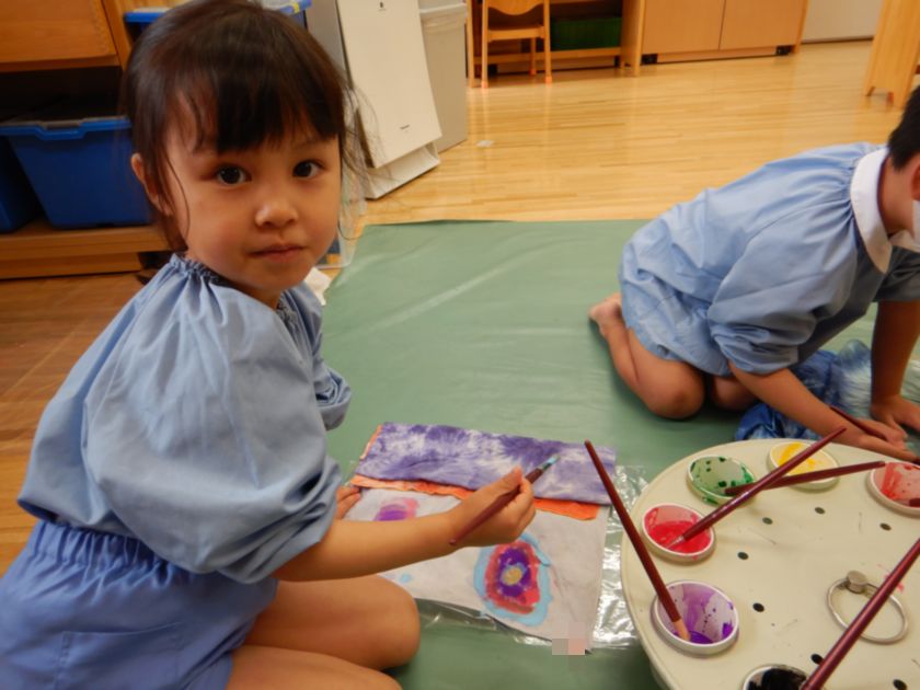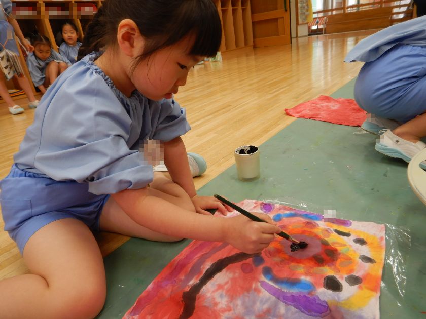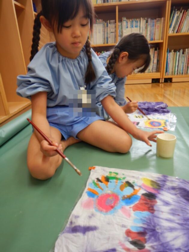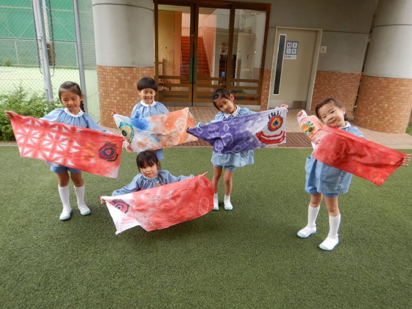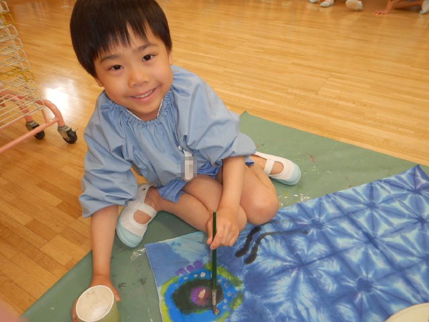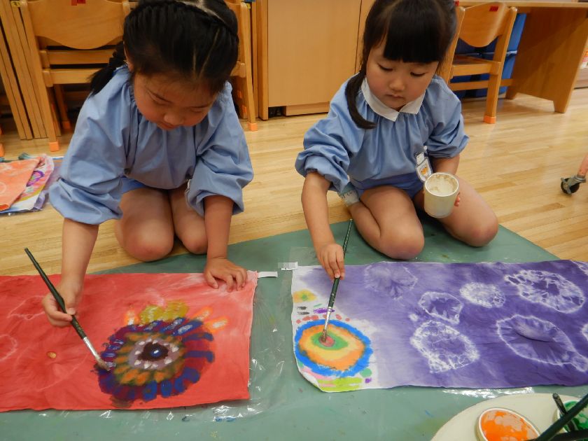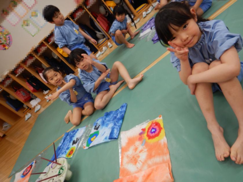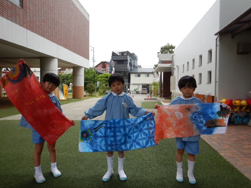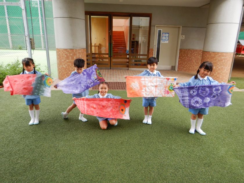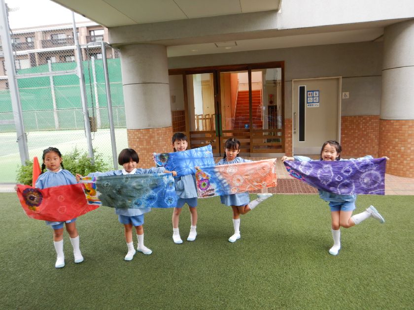 日本の伝統工芸「絞り染め」に触れ、その技に挑戦し、染め後の美しさに感動し貴重な体験をしましたね。今回は雪花絞り(せっかしぼり)布を三角形に折って板で挟む技法にも挑戦し、様々な絞り染めにも触れることができました。一人一人の絞り模様が異なり唯一無二の作品に仕上がりました!後日、年長保育室前に展示しますので是非「日本の美」をご鑑賞ください♪