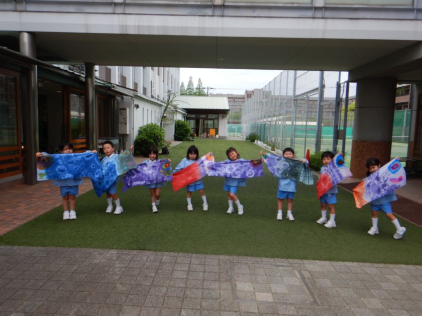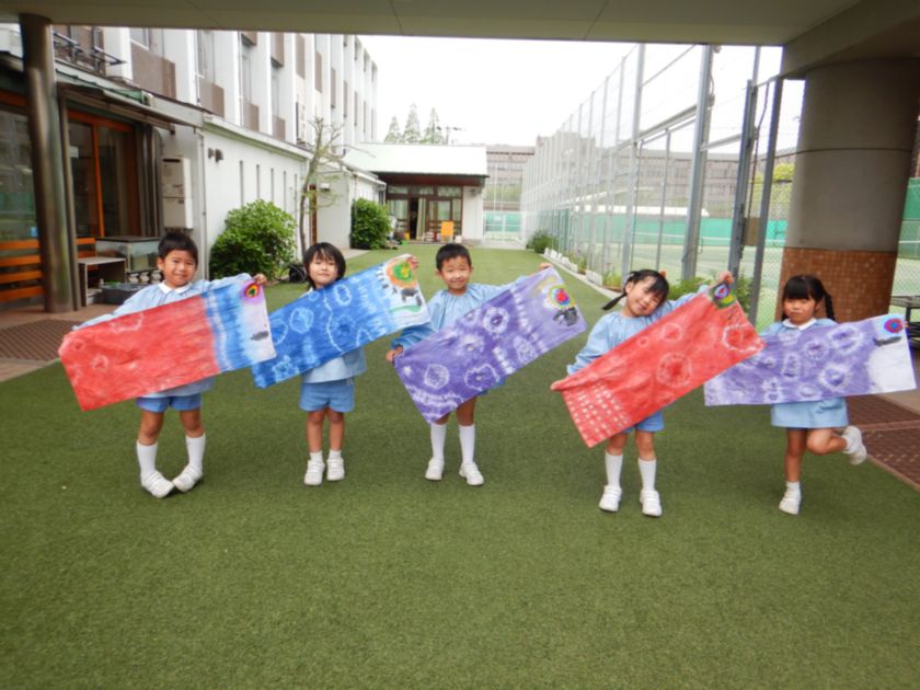 美しく完成した絞り染めに目玉を描き「こいのぼり」を完成させました。