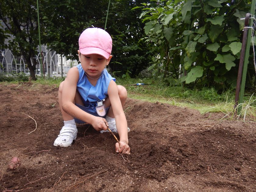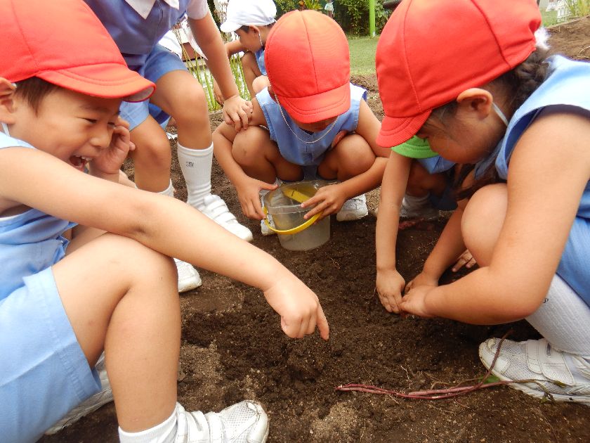 2025.10.03 アフター芋ほり 年中組 本日戸外遊びに出ると、昨日芋ほりをした畑にずんずん向かう子どもたち。 掘り返した柔らかい土の中にはミミズや幼虫、アリやお芋のツルなど心揺さぶるものがたくさん! 採りのこしたさつまいもを見つけたお友達もいましたよ。 畑はまだまだ子どもたちを楽しませてくれそうです♡