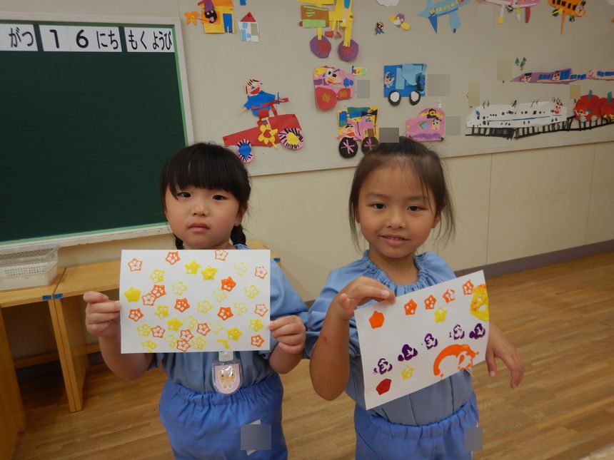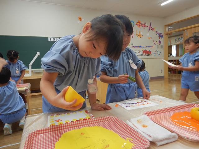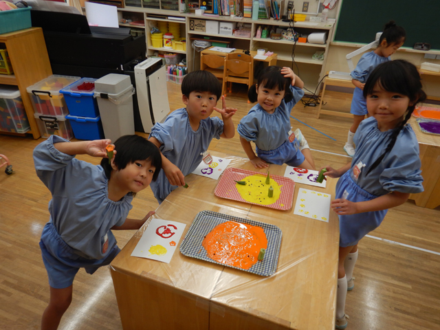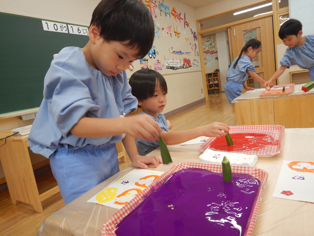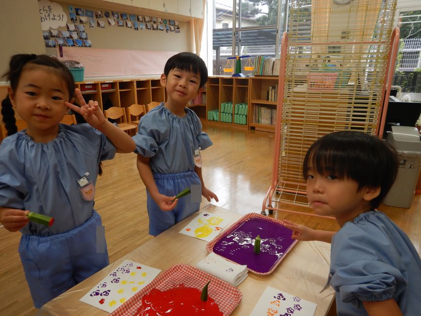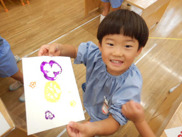 2025.10.16 おしてみよう♪ 年中組 ~野菜スタンプ~ 1学期に育てた夏野菜のおくら。そのおくらがぐんぐん伸びて今日はそのおくらと野菜でスタンプをして遊びました!野菜の断面はどんなのかな?スタンプを押したらどんなかたちになるのかな?どきどきわくわくして取り組むことができました! 子どもたちも押した野菜スタンプ、色とりどりでかわいい作品になりました!