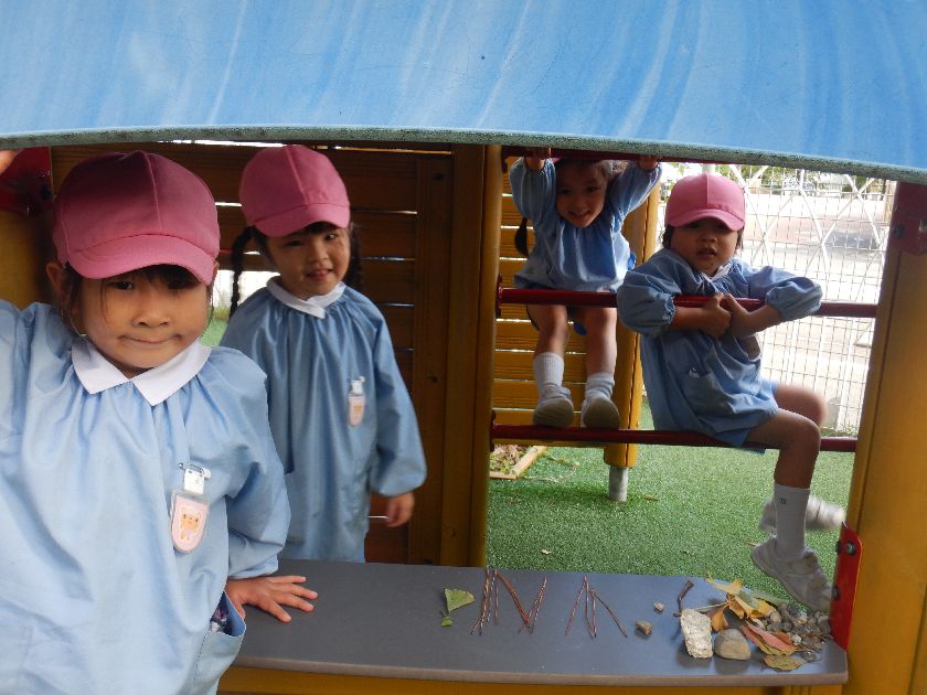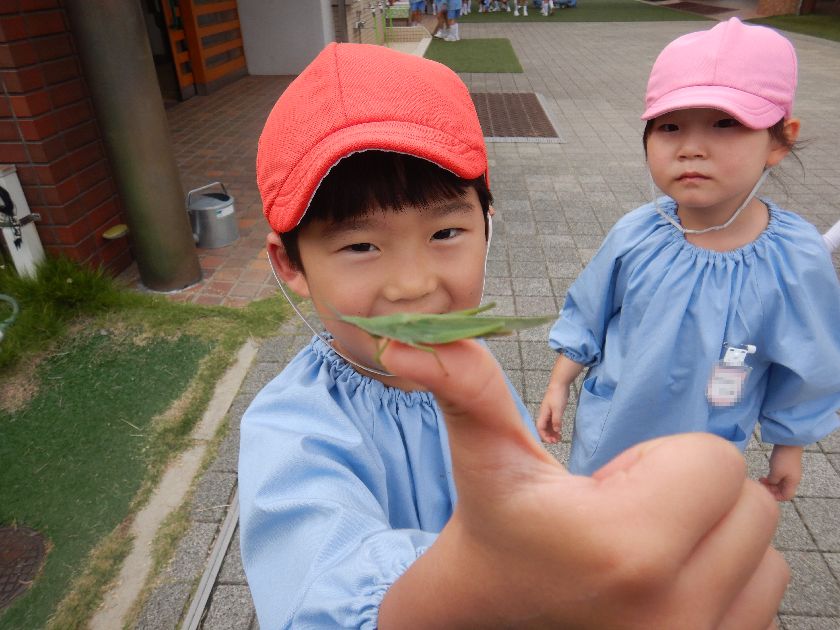2025.10.24 秋のはじまり 年中組 先週までの気候が嘘のようにぐっと気温が下がり、肌寒い風が吹き、秋らしい季節になりました。 戸外遊びではバッタを捕まえたり、柿を食べたり秋ならではの遊びをしている姿が多くみられます。 汗もかかず心地よくのびのびと遊べる季節っていいね!また秋を見つけてみよう!! はっぱやさんでーす! バッタが離れない! バッタ捕まえたよ!