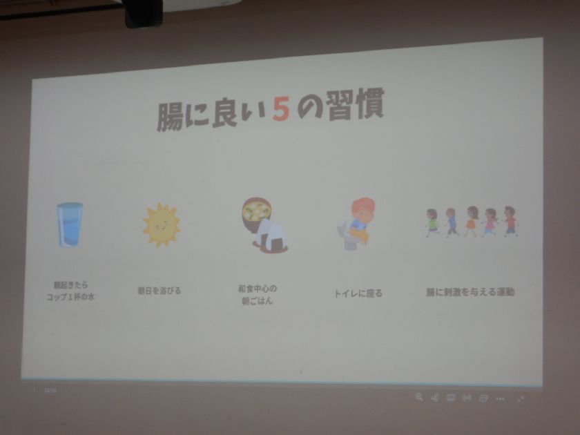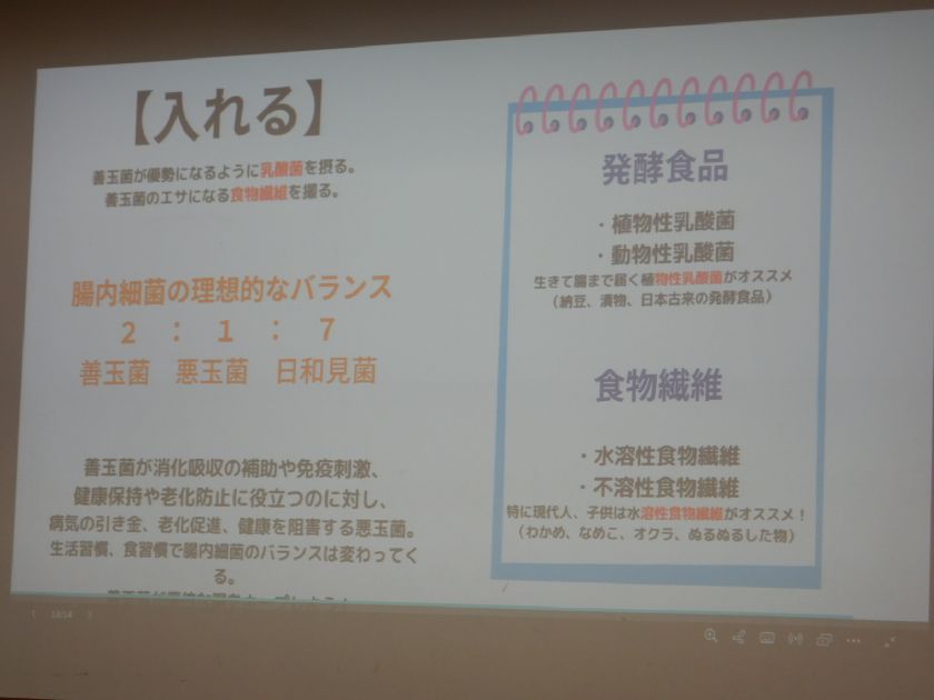 *腸には3つの菌がすんでいて、その中の一つ善玉菌が沢山増えるような食事が大切!などなど・・・。もっともっと深いお話を沢山していただきました。教員も勉強させていただきました!