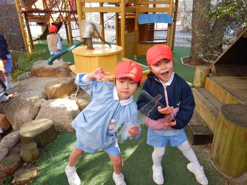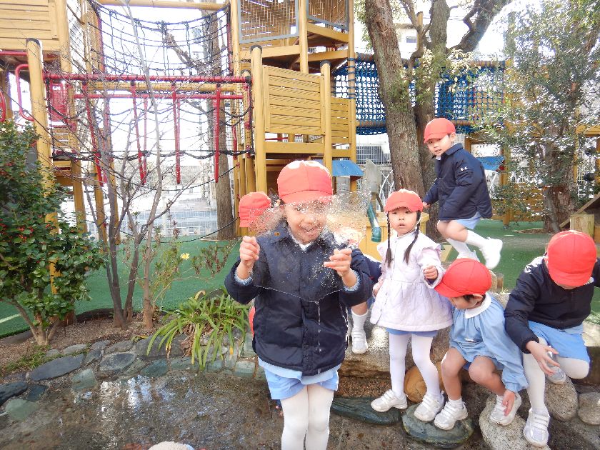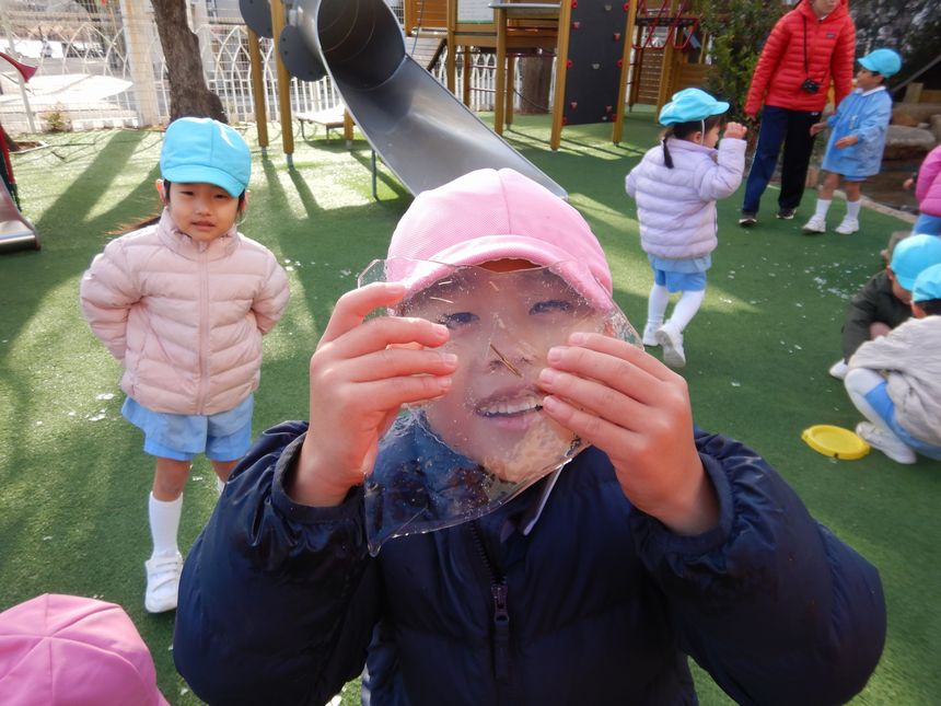 大きな氷がとれたと喜んだり、氷を顔の前に持って、向こう側が透き通って見える様子を不思議に思ったり、「冷たい冷たい!!」と手をお湯で温めながら存分に遊びを楽しんでいました!!