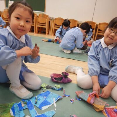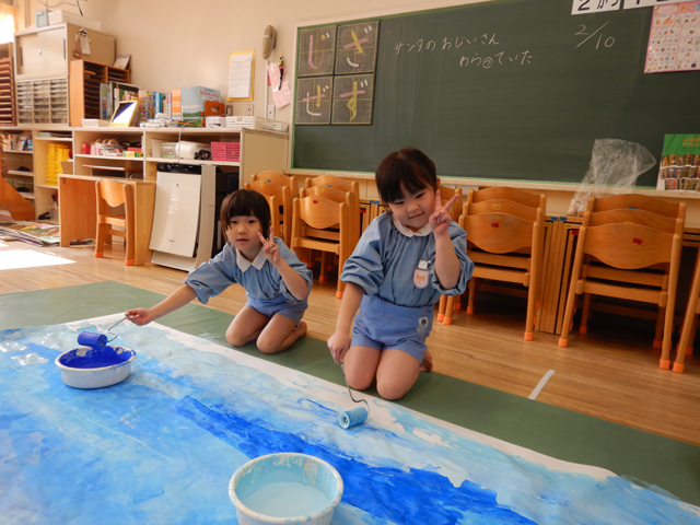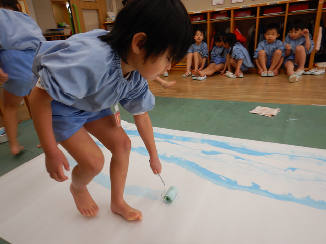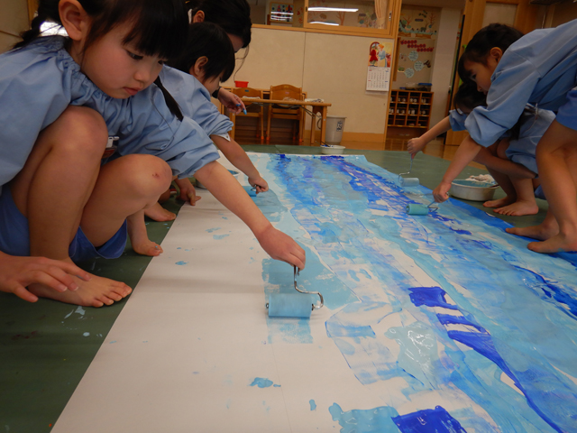 2026.02.12 みんなで力を合わせて! 年中組 なーんだ?? 今日はみんなで、なにやら大きな紙に色塗りをしてしまいました!ローラーで青色、水色をころころぬると、色が混ざってとってもきれいな色♪乾いたら、ここに今度、画用紙でお花や鳥を作って飾っていきます!それまで何を作るかは年中組さんだけの秘密!楽しみにしててくださいね!