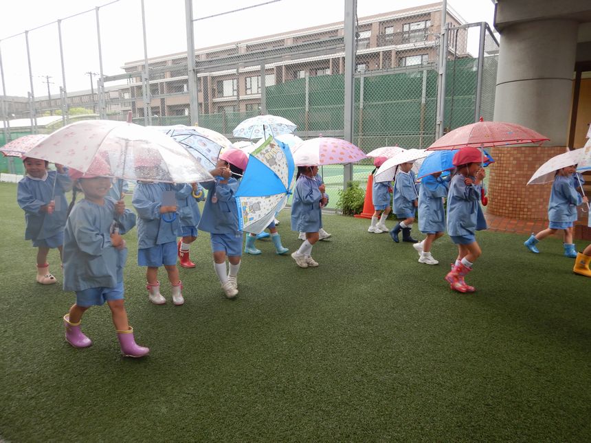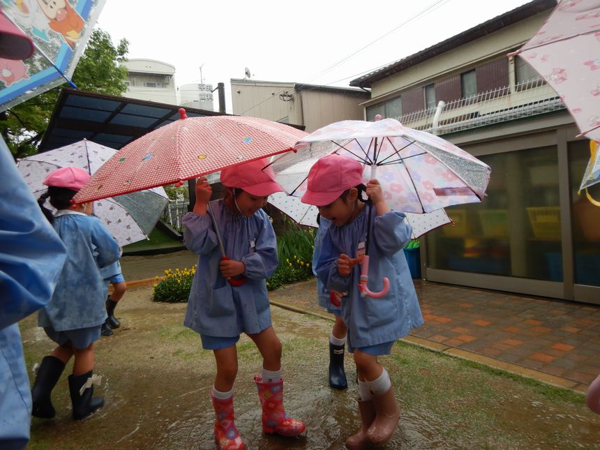 2026.04.23 雨降り散歩☂ 年中組 今日は一日中雨降り。 桃組では、お昼から傘をさして園庭の散歩に出かけました! 雨量もしっかりあったため傘に雨が当たる音が心地良かったり、大きな水たまりに長靴で入るのが楽しかったりと、良い気分転換になりましたね♪