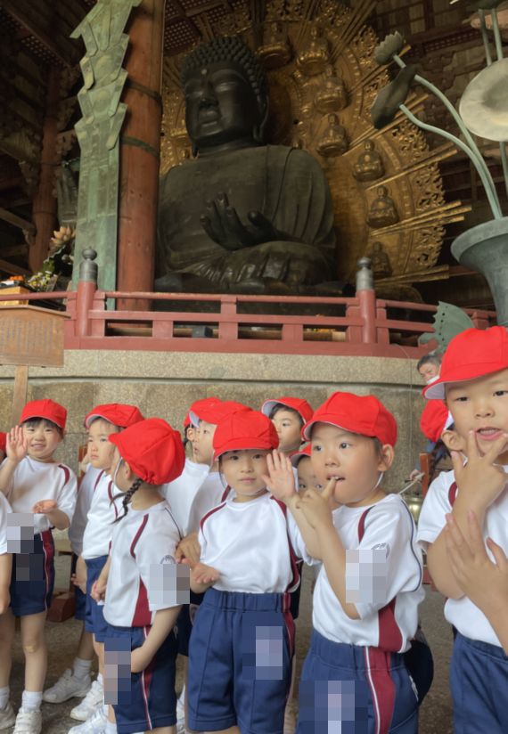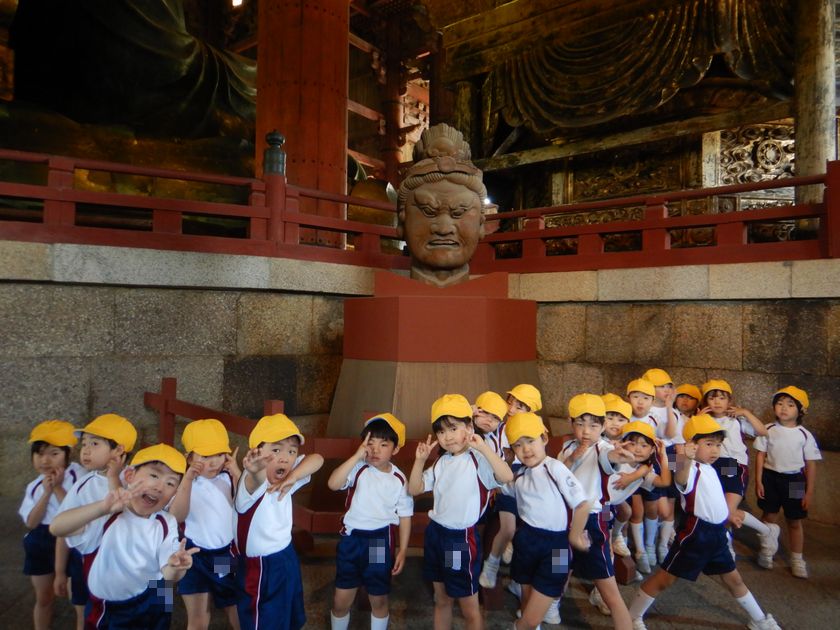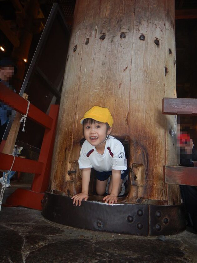 年長組の子ども達は、東大寺の中にある柱の穴(大仏様の鼻の穴と同じ大きさ)をくぐり